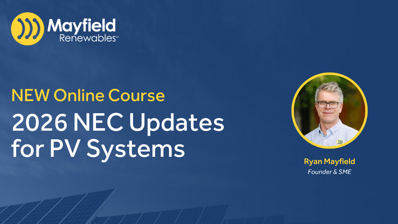 In this one-hour course, you will learn key updates to the 2026 National Electrical Code (NEC) that pertain specifically to photovoltaic systems. This course covers the code changes most relevant to PV system design, installation, and interconnection to keep your projects compliant.